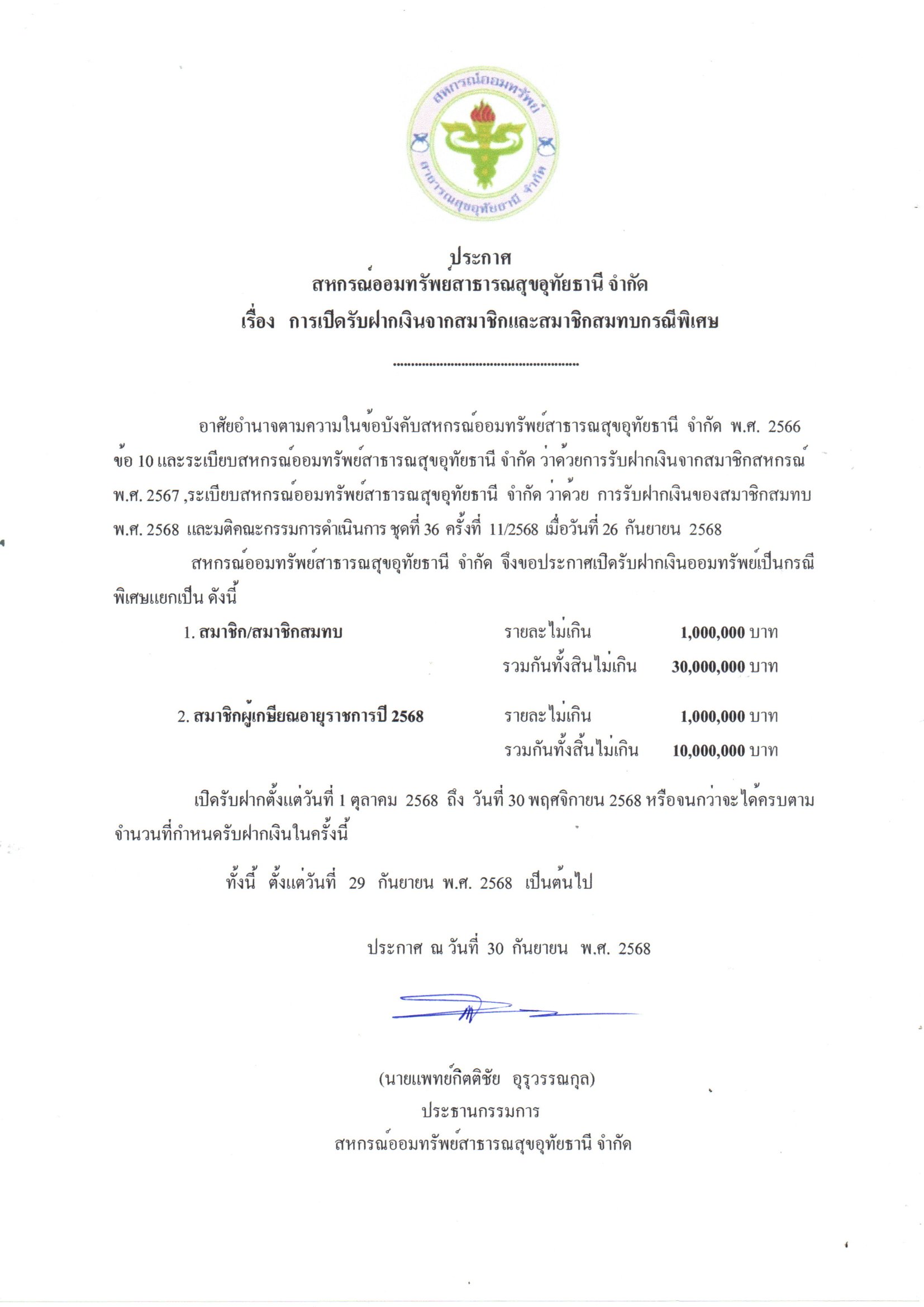 ประกาศ เรื่อง การเปิดรับฝากเลินจากสมาชิกและสมาชิกสมทบกรณีพิเศษ
