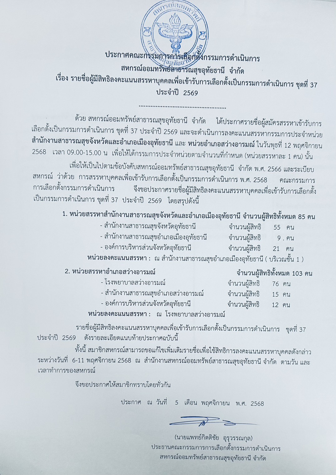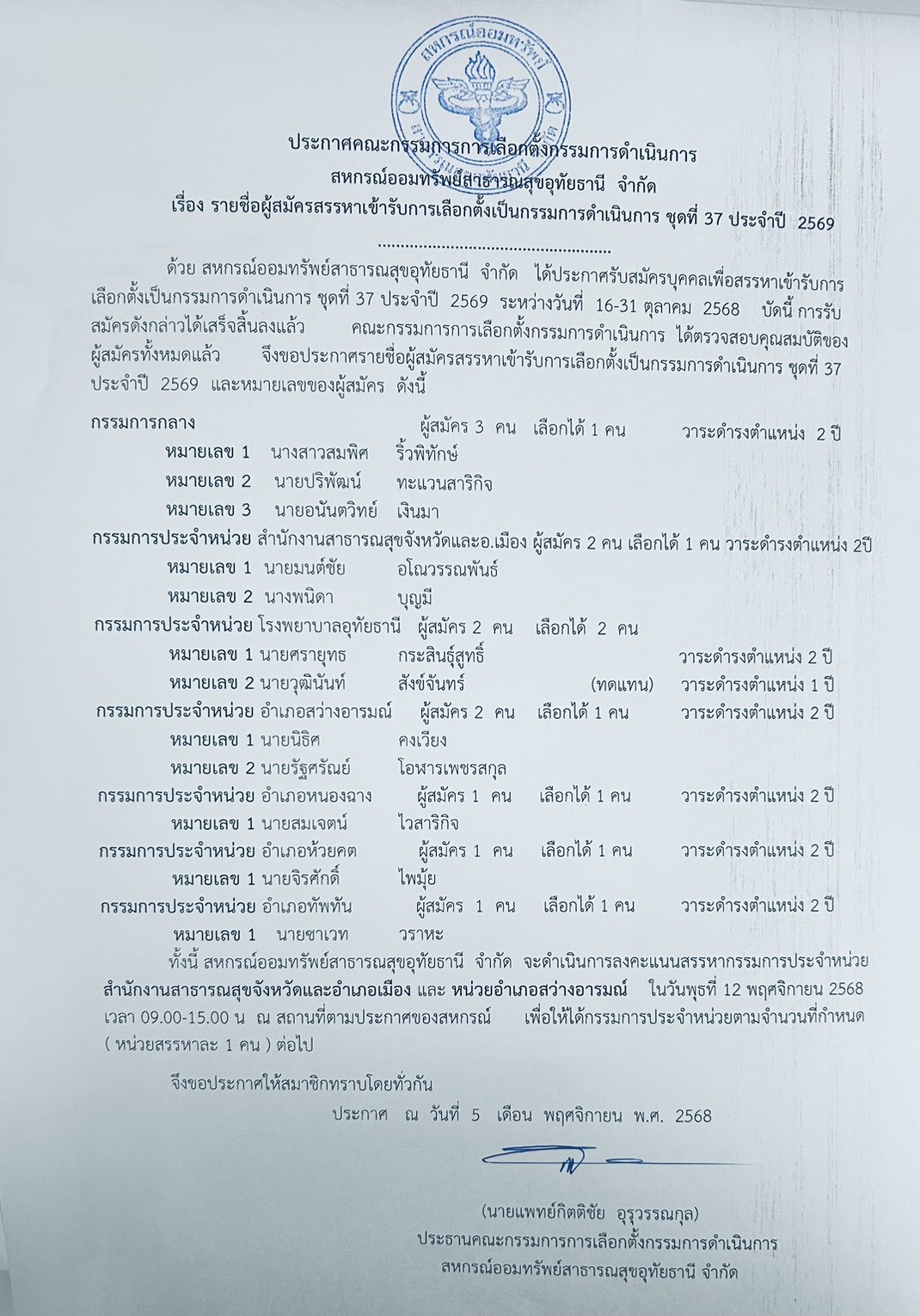 ประกาศ เรื่อง รายชื่อผู้สมัครสรรหาเข้ารับการเลือกตั้งเป็นกรรมการดำเนินการ ชุดที่ 37 ปี 2569
