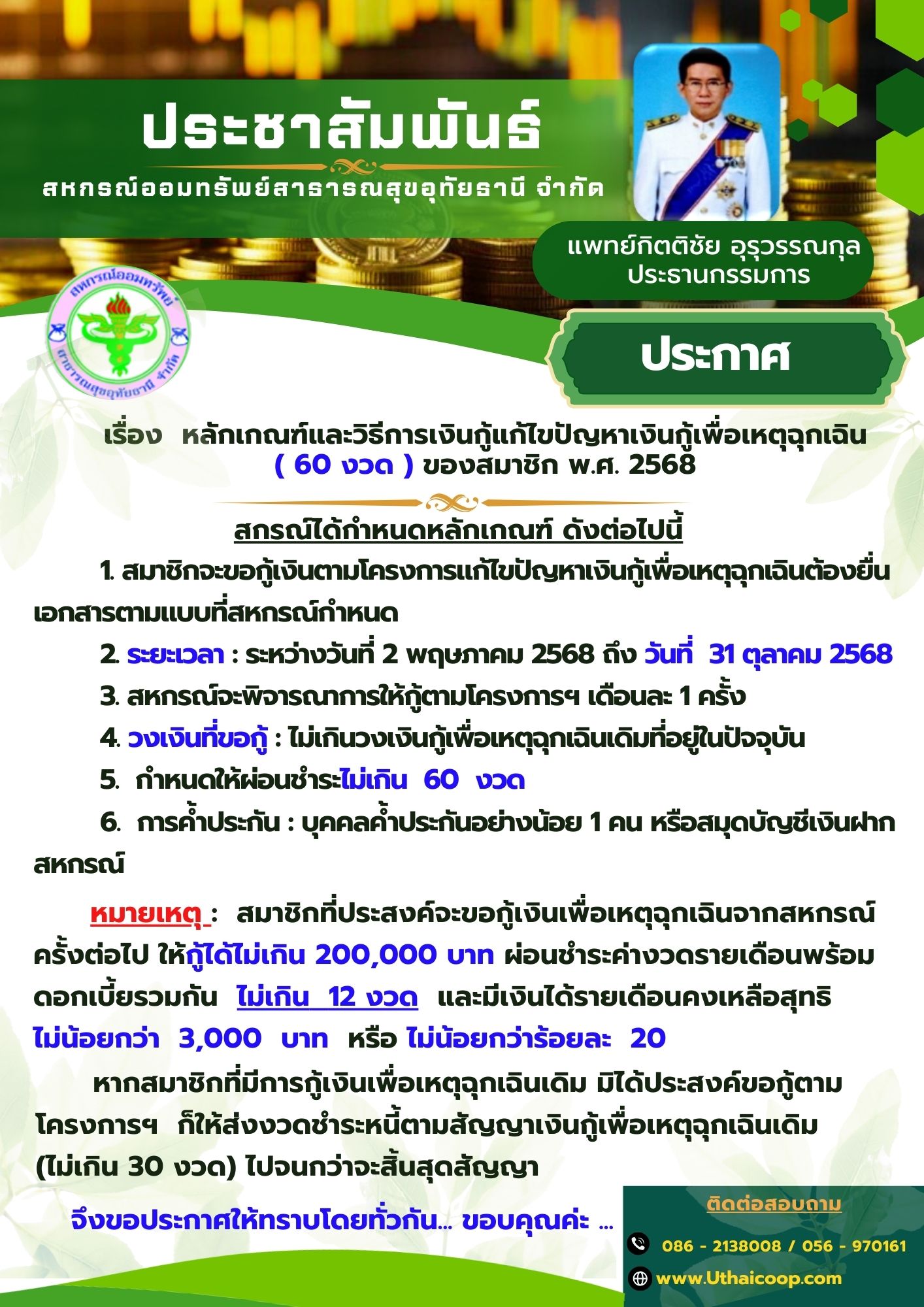 ประชาสัมพันธ์ เรื่อง หลักเกณฑ์และวิธีการเงินกู้แก้ไขปัญหาเงินเพื่อเหตุฉุกเฉิน (60 งวด )